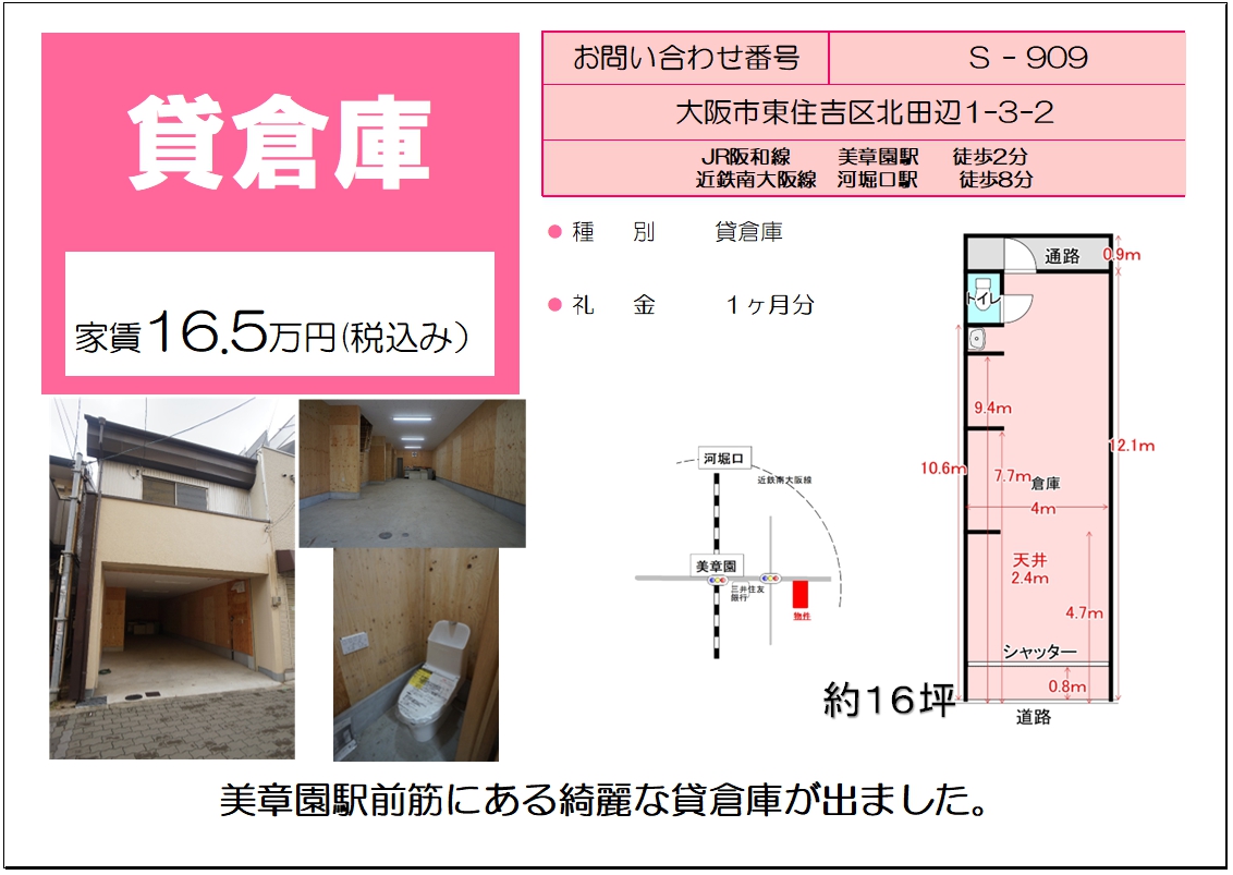 倉庫・東住吉区北田辺1 | 1ヶ月分・16.5万 |
