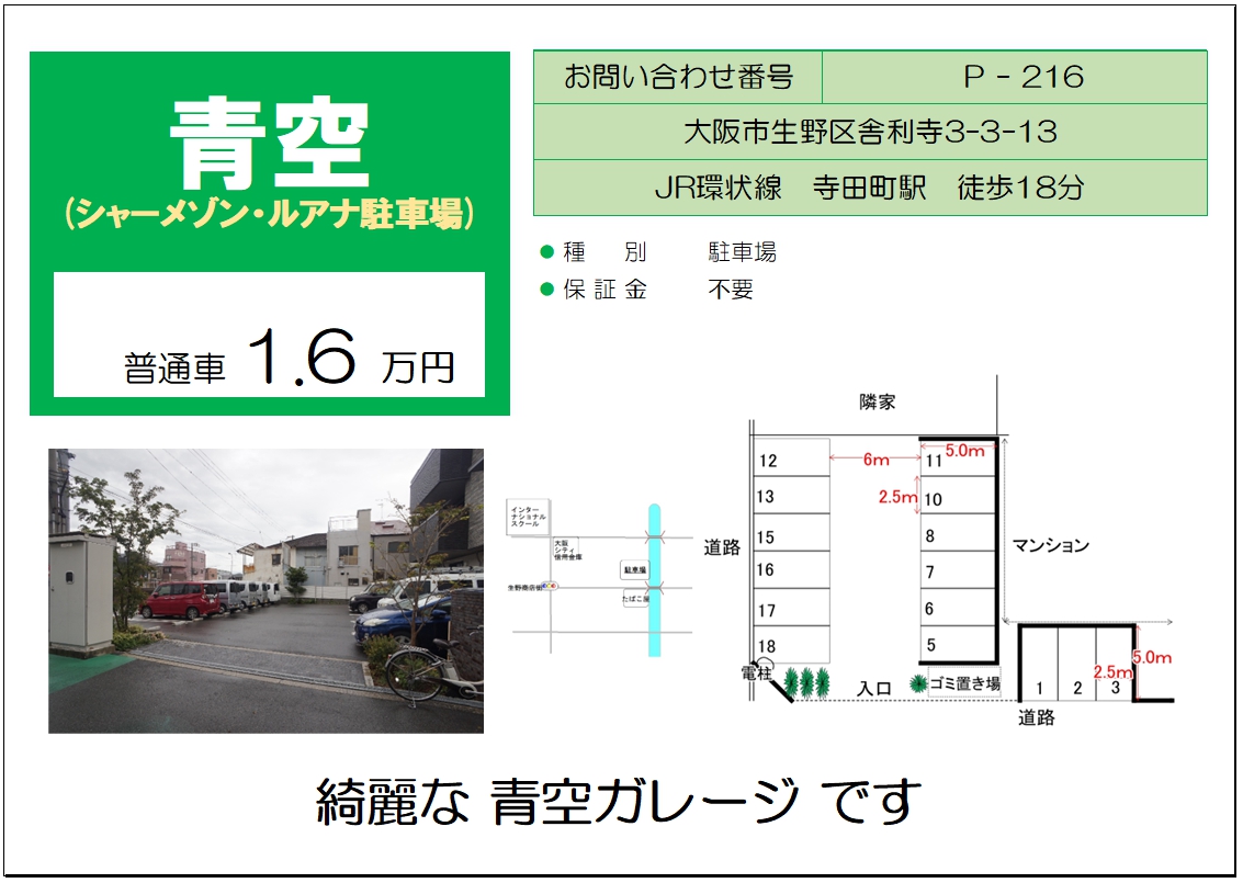 青空屋根付・生野西4 | なし・青空1.4万円/屋根付1.8万円・山本モータープール | |