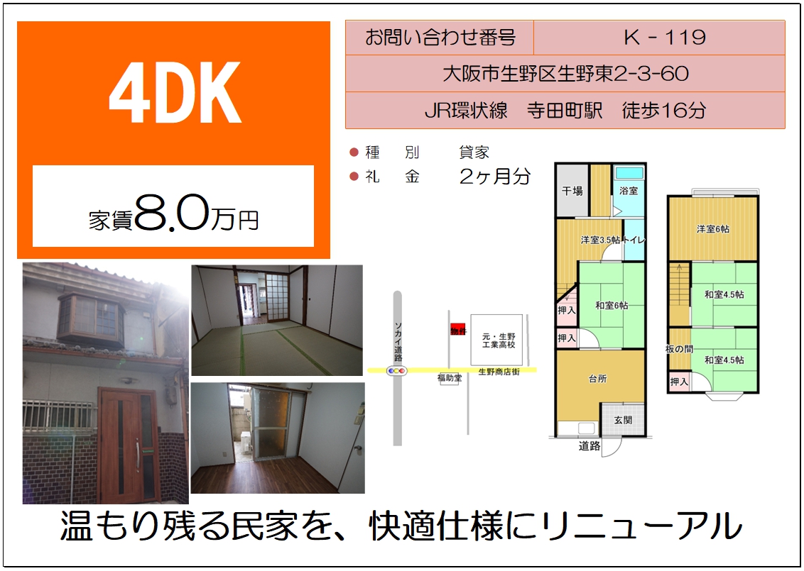 2階建・生野東2 | 2ヶ月分・8.0万円・4DK | |