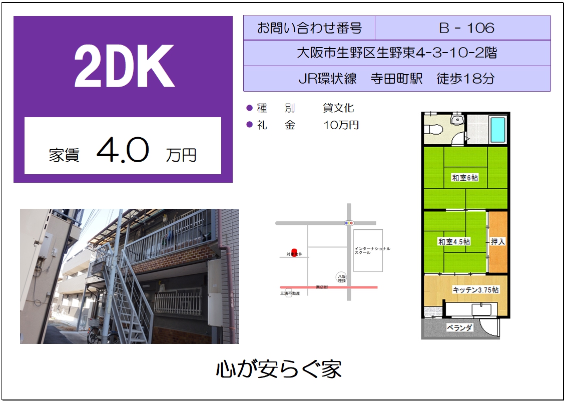 文化住宅2階・生野東4 | 10万円・4.0万円・2DK | |