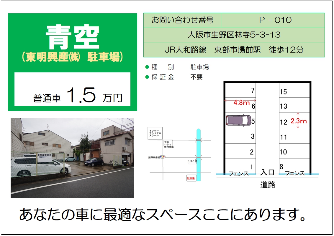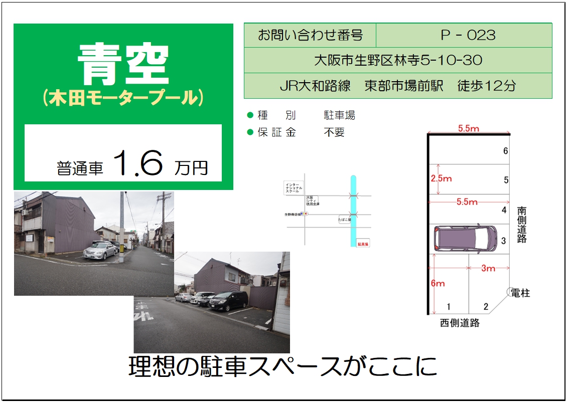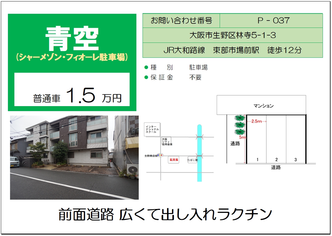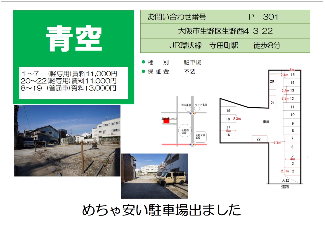 青空・生野東1 | なし・軽1.3万円/普通車1.4万円・若草モータープール | |