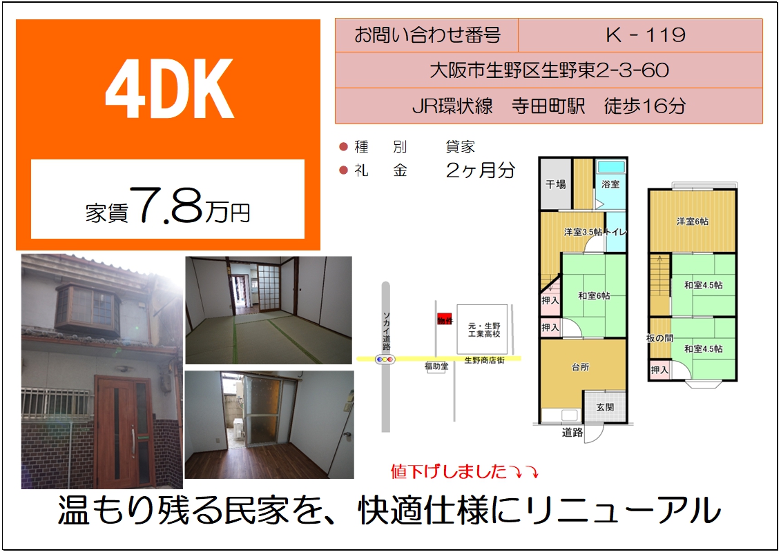 2階建・生野東2 | 2ヶ月分・7.8万円・4DK | |