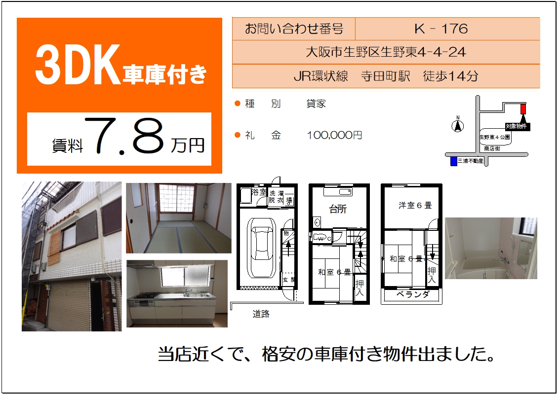 3階建・生野東4 | 10万円・7.8万円・3DK車庫付 | |